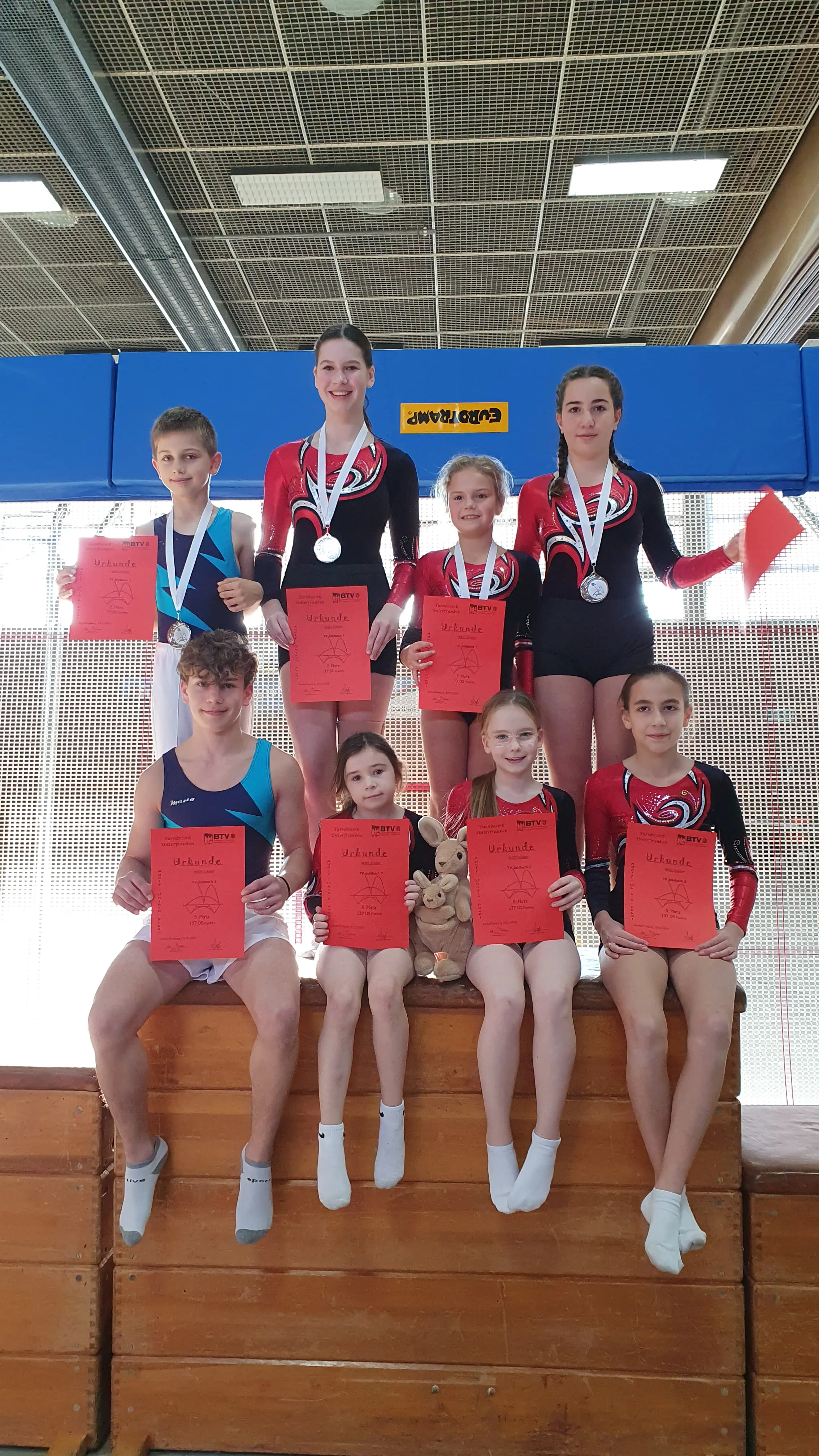 Mit zwei Übungsabbrüchen im ersten Durchgang und somit ohne Streichwertung kämpfte die 2. Mannschaft noch um den Einzug ins Finale, was sie dann knapp verpasste. Trotzdem ein Lob an alle Sportler, denn gerade die zwei Wettkampfneulinge Paula und Finja mussten sich erst einmal in das Wettkampfgeschehen einfinden.